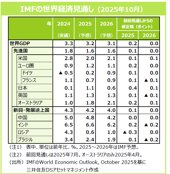 IMFによると、米国の関税措置は各国・地域との協定などによって一部緩和されたものの、世界経済の成長率は2025年に+3.2%、2026年に+3.1%へと鈍化する見込みです。