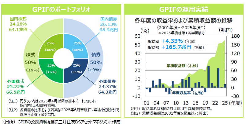◆⽇本の公的年⾦(厚⽣年⾦保険と国⺠年⾦)の運⽤はGPIF(年⾦積⽴⾦管理運⽤独⽴⾏政法⼈)が担っています。その運⽤資産額は約260兆円(2025年6⽉末現在)にのぼり、「世界最⼤級の年⾦基⾦」となっています。GPIFは、インフレやデフレをはじめとする様々な運⽤環境の下で、⻑期にわたり安全かつ効率的に年⾦積⽴⾦を運⽤するため、複数の資産を組み合わせて運⽤する「分散投資」を⾏っています。