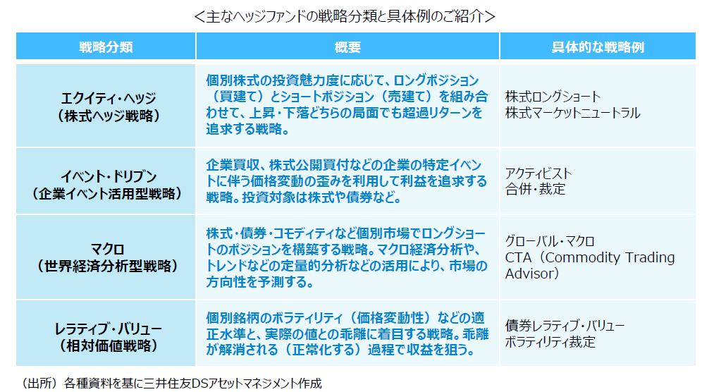 ヘッジファンドとひとことで⾔っても、株式ロングショートやグローバル・マクロなどさまざまな戦略があります。市場環境に応じて柔軟に投資ポジションを調整できるため、伝統的資産では得られにくい絶対収益の追求や下落局⾯でのリスクヘッジを可能とするものもあり、機関投資家や富裕層を中⼼に注⽬を集めています。