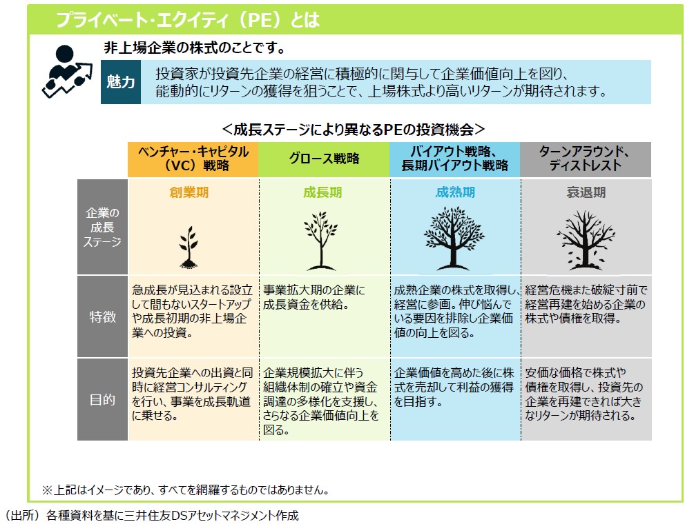 近年、世界の⾦融機関がプライベート資産への投資を増やしています。また、個⼈投資家向けのプライベート資産を投資対象としたファンドも増加傾向にあります。プライベート資産は、上場株式や債券などの伝統的資産と異なるリスク・リターン特性を有する「オルタナティブ資産」の⼀つであり、その代表例として、プライベート・エクイティ(⾮上場株式)やプライベート・クレジット(ファンドなどによる融資)が挙げられます。