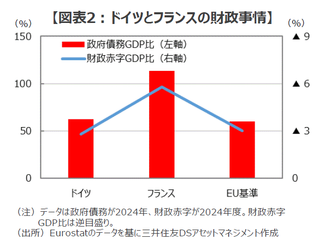 ■2024年のフランスの一般政府債務残高はGDP比約113.2%(ドイツは約62.5%)、2024年度の財政赤字はGDP比約5.8%に達し(ドイツは約2.8%)、いずれもEUの財政ルール(一般政府債務残高GDP比60%以下、財政赤字GDP比3%以下)を大きく超えていて、財政再建を迫られています。このため、フランスがドイツと歩調を合わせて防衛力の強化を続けていくことは、政治的・財政的に並大抵のことではないように思われます(図表2)。