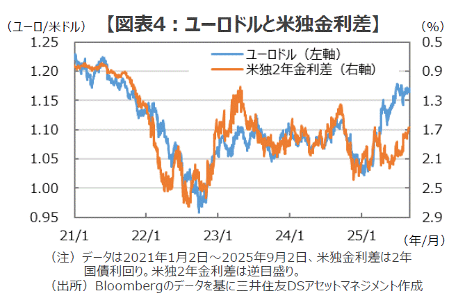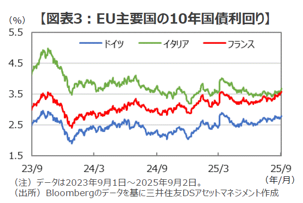 ■仮に、こうした見立てが正しいならば、債券市場では財政基盤の弱いフランスは、継続的に強い金利上昇圧力にさらされることになります。ここもと、フランス国債の利回りは大きく上昇して、ドイツ国債に対する上乗せ幅が拡大するとともに、かつては2%近くあったイタリア国債との利回り差はほとんどなくなっています。こうしたフランスの長期金利の上昇は、足元の政治的な混乱もさることながら、欧州の「再軍備」を背景とした構造要因による影響も無視できないように思われます(図表3)。