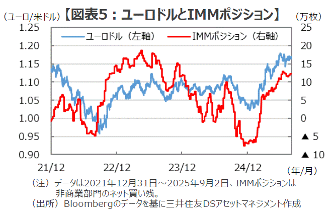 ■この数年あまり、ユーロドルレートはもっぱら米独の2年国債利回りの差に沿って動いてきたように見受けられます。しかし、今年に入ってからは、トランプ大統領がもたらす不確実性への懸念もあってこの金利差から乖離したユーロ高が続いています(図表4)。また、投機筋の動きを示すとされるIMMポジション(非商業部門)を見ると、このユーロ高が進む過程で「ユーロ買いポジション」が高水準に積み上がっていることが確認できます(図表5)。もし、欧州の不安定化が市場で意識されるようなら、こうした投機的なポジションが巻き戻されることで、米独の金利差から乖離したユーロ高は大きな修正を迫られる可能性があるのではないでしょうか。