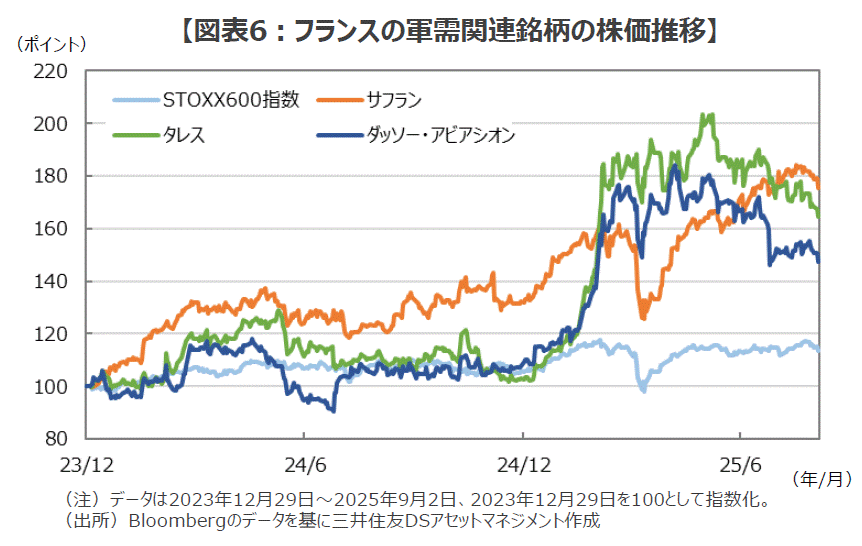 ■また、株式市場では、欧州の「再軍備」を手掛かりに、軍需関連銘柄が大きく上昇してきました。中でも、世界第2位の武器輸出大国であるフランスの防衛関連企業は時価総額も大きく、サフラン、タレス、ダッソー・アビアシオンといった銘柄は今年の欧州の株高を支えてきました(図表6)。しかし、フランスの財政が厳しい状況下、米国製の防衛装備品の導入に積極的なドイツを説得できない場合、こうした株高を支えてきた「期待」は梯子をはずされることになりかねないでしょう。