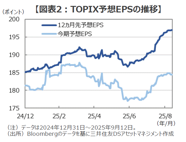 ■そして、その後の今期予想EPSと12カ月先予想EPSの推移を見ると、低下トレンドは6月末を底に大きく反転していて、直近のピークだった4月のトランプ関税発表直前の水準を大きく超えて、日本企業の「業績改善トレンド」が鮮明になっています(図表2)。