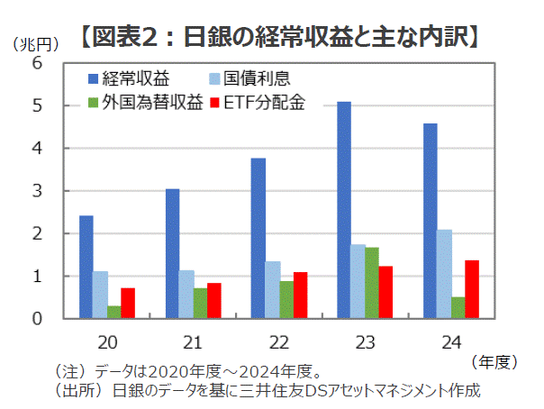 ■日銀のETF売却ペースが遅い背景について、やや斜に構えて勘ぐっていくと、2つのことに思い当たります。まず1点目は、ETFがもたらす分配金(配当金)の大きさです。現在、日銀は時価で約70兆円の日本株ETFを保有しているので、今期の東証プライム指数の予想配当利回り(約2.27%、9月19日時点)で試算すると、年間約1.6兆円の分配金を受け取る計算になります。ちなみに、2025年3月期の日銀の決算を見ると、売上に相当する経常収益は約4.6兆円、うち国債の利息収入が約2.1兆円、ETFの分配金が約1.4兆円となっており、ETFが日銀にとって重要な収益源となっていることが確認できます(図表2)。