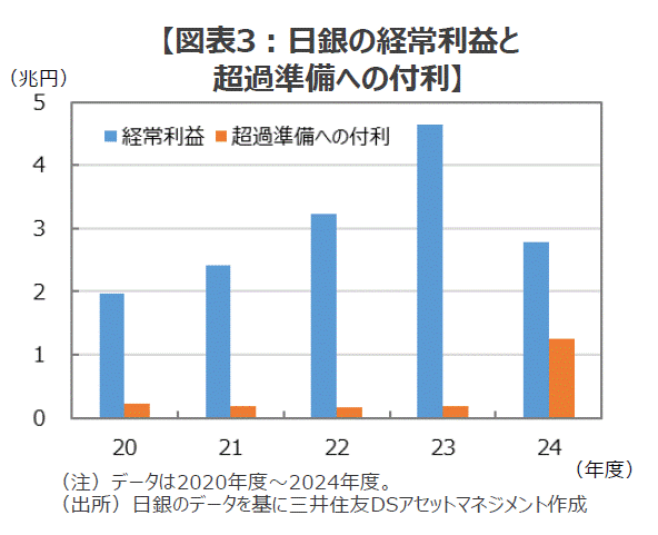 ■この超過準備に対する「付利」は2025年3月期には前年度比約6.6倍の約1.3兆円に急増して(図表3)、日銀が保有する長期国債利回りをこの付利の金利が上回る逆ザヤが初めて生じたと伝えられています。日銀の企画局企画調整課は2024年12月に公表した日銀レビュー「日本銀行の財務と先行きの試算」の中で、バランスシートの縮小局面では、①当座預金(超過準備)が減少するにつれて支払利息が減少する一方、②保有国債は利回りの高い国債に順次入れ替わるため、③一時的に赤字が発生する可能性はあるが、いずれは収益が回復していく、としています。