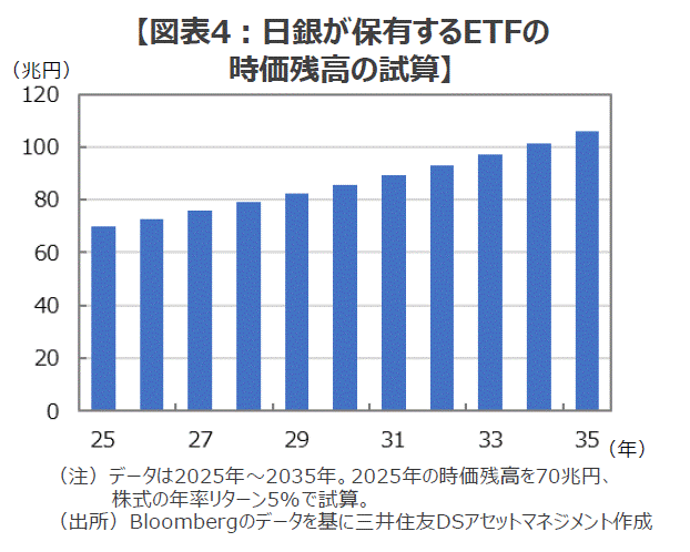 ■ちなみに、TOPIXは過去10年間に平均で年率約7.2%、日経平均は同約8.5%上昇してきました(2015年8月末~2025年8月末の幾何平均、配当除く)。もし、保守的に見て日本株が今後も年率5%のペースで上昇を続けると仮定すると、たとえ毎年6,200億円分のETFを売却しても、日銀の保有するETFの時価残高は増加を続け、現在約70兆円の残高は2030年には約86兆円、2035年には約106兆円に達する計算になります(図表4)。
