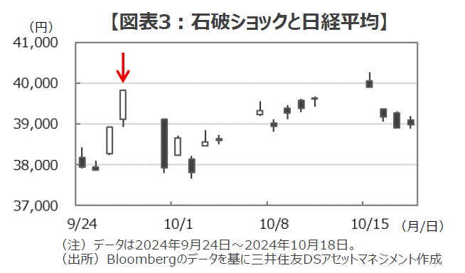 ■こうした観点から「高市トレード」のインパクトについて考えるなら、過去の自民党内における想定外のトップ交代がヒントとなるように思われます。例えば、昨年9月の自民党総裁選で予想を覆して石破新総裁が誕生した際には、高市氏の勝利を見越してそれまで上昇していた日経平均は一転急落し、3日間で2,020円80銭(▲5.1%)下落して「石破ショック」と呼ばれました(図表3)。また、約4年前の2021年9月、当時の菅総理の退陣観測を受けて、日経平均は8営業日で2,126円59銭も上昇(+7.5%)しました(図表4)。しかし、いずれも「自民党内」でのトップ交代にすぎなかったことで市場のトレンドを大きく変えるようなインパクトはなく、株価は時を置かず元の水準へと収束することとなりました。