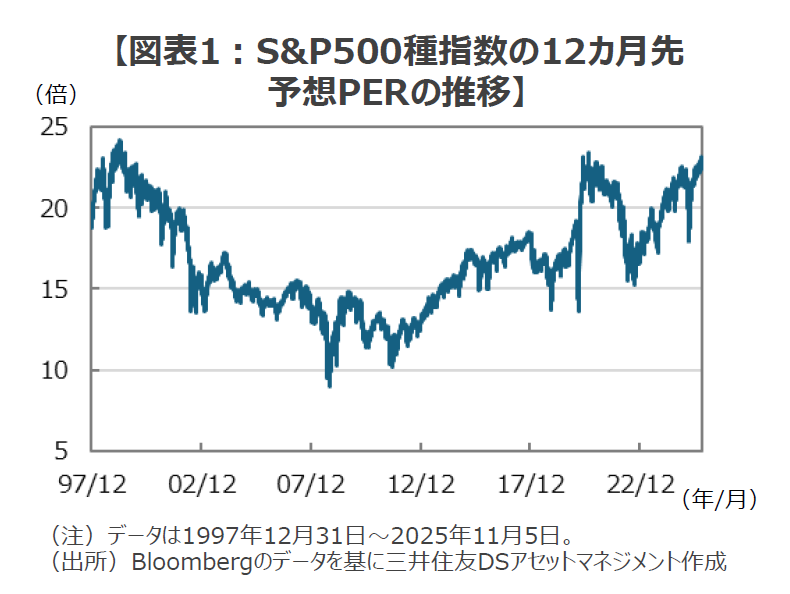 ■市場参加者の多くがこうした「売り仕掛け」に敏感な背景には、米国株の割高感への警戒感がありそうです。というのも、米S&P500種指数の予想株価収益率(PER)は2000年のインターネットバブルの時期の水準に迫る、歴史的な高水準に達しているからです(図表1)。