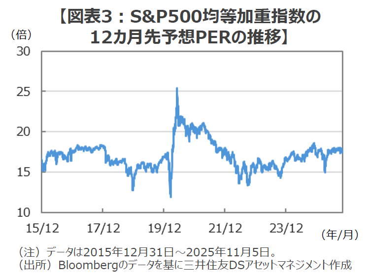 ■ちなみに、こうした特定の銘柄や業種のウエイト変動の影響を排除するため、指数構成銘柄をすべて等金額で保有するS&P500均等加重指数のPERを見ると、足元の水準は約17.5倍で概ね過去の平均的な水準にあることが確認できます(図表3)。
