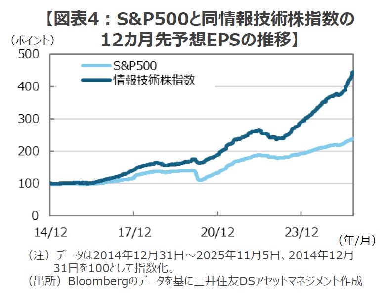 ■次に、S&P500の予想PERを大きく押し上げているハイテク株の業績とバリュエーションについて詳しく見てみましょう。米国の代表的な大手ハイテク株が多く含まれるS&P500情報技術株指数の予想一株当たり利益(EPS)は過去10年に約4.4倍(幾何平均年率約+15.9%)に増加していて、S&P500種指数全体の同約2.4倍(同年率約+9.2%)を大きく上回っています(図表4)。