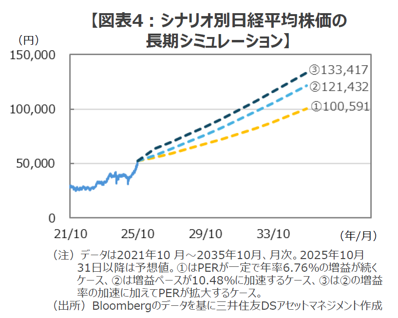 ■現在、日経平均は約5万円ですが、①PERが一定で6.76%の増益ペースが続くケースでは、10年後に約10万円へ上昇する計算になります。一方、②設備投資により増益ペースが加速するケースでは約12.1万円、さらに、③PERの拡大が加わると約13.3万円まで日経平均の上昇は加速する計算になります(図表4)。