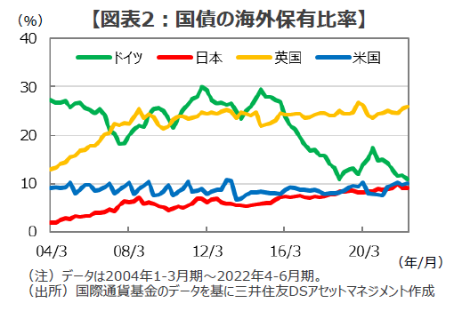 ■トラスショックで英国の金融市場のボラティリティが急騰した背景の2点目として、対外ポジションの問題が指摘できます。英国は慢性的な経常収支赤字国ですが、英国政府が発行する国債の約2~3割は海外投資家が保有しています(図表2)。こうした英国の海外投資家に依存した資金調達構造は、英国債および通貨ポンドのボラティリティを慢性的に押し上げ、市場の不安やショックへの脆弱性を高めることとなっているようです。