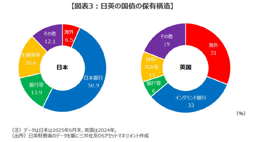 ■また、日本の対外ポジションは英国とは大きく異なります。日本の経常収支は大幅な黒字が続いて、対外純資産は世界有数の規模で6年連続で史上最高額を更新しています。さらに、日本国債の海外投資家による保有割合は約6.5%にとどまり(2025年6月末)、海外投資家の保有比率が約31%(2024年9月末時点、英財務省)に達する英国とはかなり事情が異なります(図表3)。こうした海外資金の中にはヘッジファンドのような足の速い資金も少なからず含まれますが、海外投資家による国債保有比率の差は、日本と英国の債券市場のボラティリティの差、市場の不安やショックへの耐性の差につながっているようです。