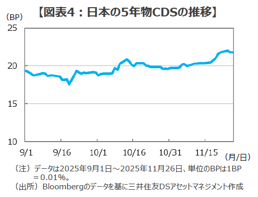 ■さらに、債務不履行リスクを示すクレジット・デフォルト・スワップ(CDS)を見ると、トラスショック時に英国のCDSは9月6日の0.24%から10月3日には0.50%まで急騰していますが、日本のCDSは高市政権誕生以降大きな動きは見られず、この1カ月余りの上昇幅は0.02%(0.20%→0.22%)にとどまります(図表4)。