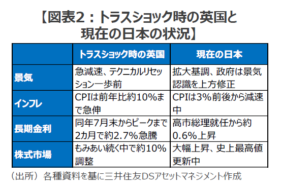 ■ちなみに、当時の英国経済は、①約10%のインフレと景気の失速が同時進行するスタグフレーション的な様相を呈しており、②長期金利はトラスショック前から急上昇(7月末の1.8%からトラスショックのピーク時の約4.5%まで約2.7%上昇)し、③株式市場は軟調な調整局面でした。