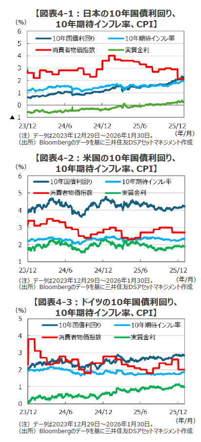 ■さらに、②長期金利の水準から市場の期待インフレ率を引いた実質金利は、米国が約1.9%、ドイツが約1%である一方、日本では最近プラスに転じたとはいえ約0.3%に留まります(図表4-1、2、3)。