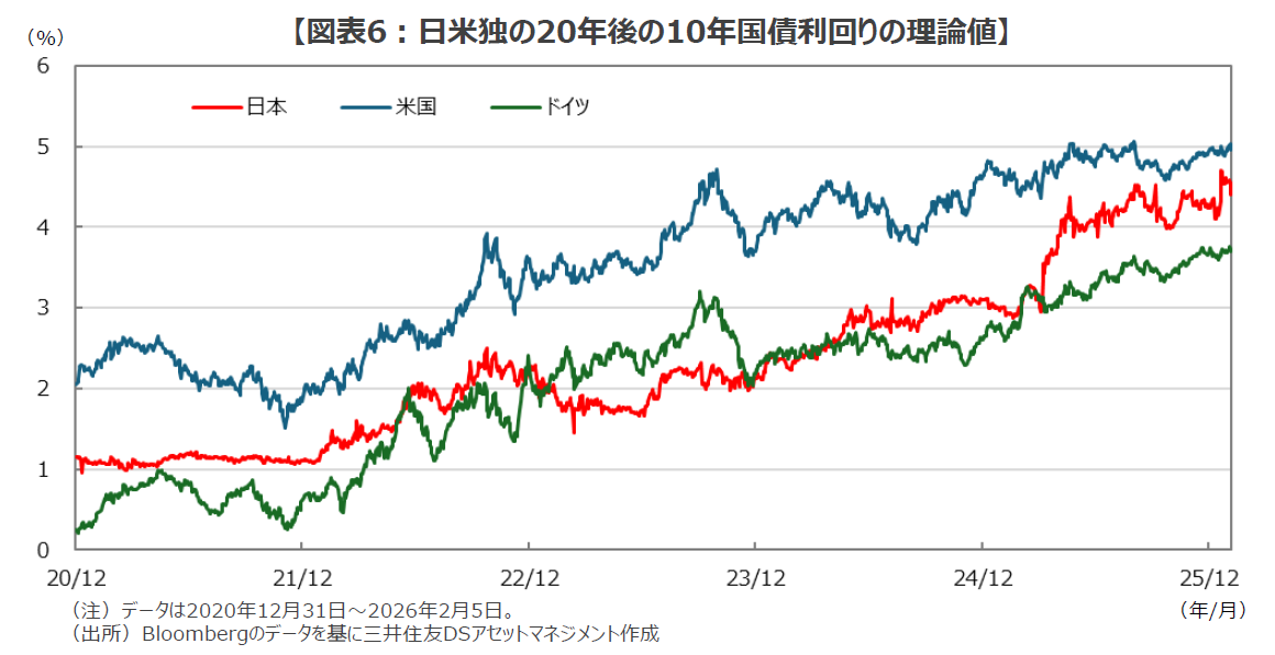 ■そして、現在の日本の長期国債を同じく魅力的と感じて買い進んでいる海外投資家が少なくないようです。例えば、将来のある時点の金利水準を取引するデリバティブにFRA(Forward Rate Agreement、金利先渡し契約)がありますが、日本の20年後の10年国債利回り理論値は足元で約4.4%にまで達しています(図表6)。しかし、日本の潜在成長率や長期的なインフレ動向を勘案すると、新興国や米国ならいざ知らず、いささか「売られすぎ(金利が高すぎ)」の可能性が高く、一部の海外投資家は魅力的な投資機会と映っているようです。