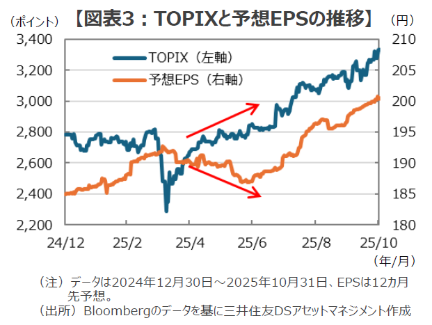 ■たとえプロの投資家であっても、相場を読み切って上手に立ち回ることは稀で、相場が動いてからその背景やファクトに気づくことが少なくありません。昨年2025年を振り返っても、アナリストが企業の業績予想の上方修正を始め、実際に業績が改善し、予想外の好決算に市場が沸いたのは、マーケットが大きく上昇した後、ないしは、上げ相場の「おいしい時期」が過ぎた後でした(図表3)。