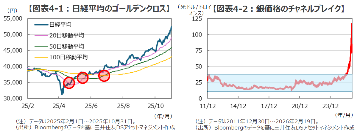 ■まず、①世界中の様々な投資市場の中から、値動き、出来高、流動性などから投資先を選びます。例えば、短期の移動平均が長期の移動平均を上に突き抜けるゴールデンクロスが生じていて(図表4-1)、最近のトレーディングレンジを上に突き抜ける動き(チャネルブレイク)がみられ(図表4-2)、出来高が増加中であり、ポジションをとるのに十分な市場規模・流動性がある投資対象を選びます。