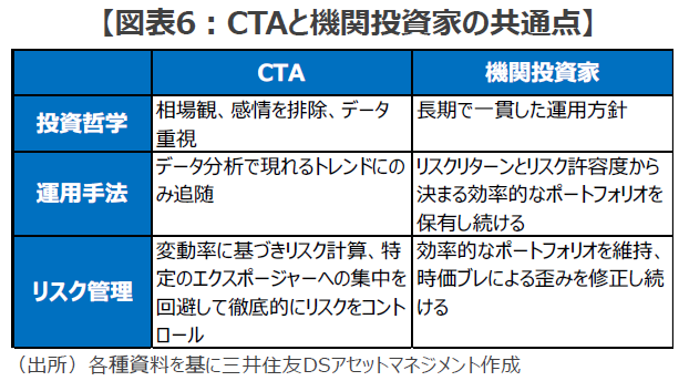■これまで機関投資家とは対極ともいえるCTAの代表的な取引手法(BO&TF戦略)について見てきましたが、意外にも両者には本質的な共通点があるようです。それは、両者の投資哲学ともいうべき部分で、①相場観や運用者の感情は投資判断から排除され、②あらかじめ決められたルールに従い粛々と投資判断がなされ、③徹底したリスク管理で守りを固めて相場に留まり続ける、ということです(図表6)。